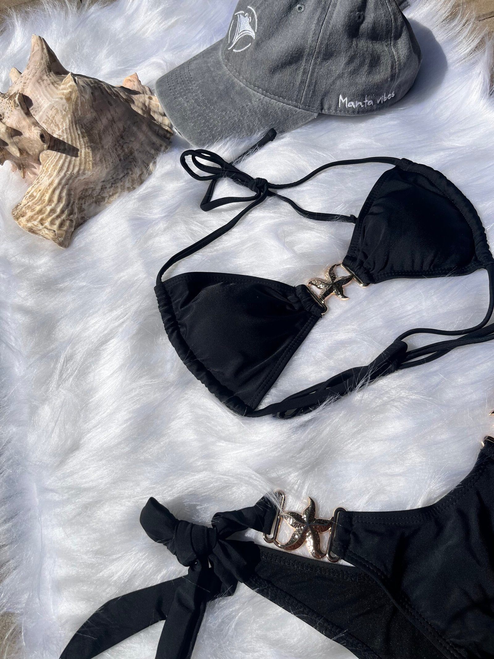 El verano se siente mejor con la malla Starfish es el toque perfecto entre elegancia y frescura, disponible en celeste y negro con detalles metalicos que capturan la esencia del mar.
